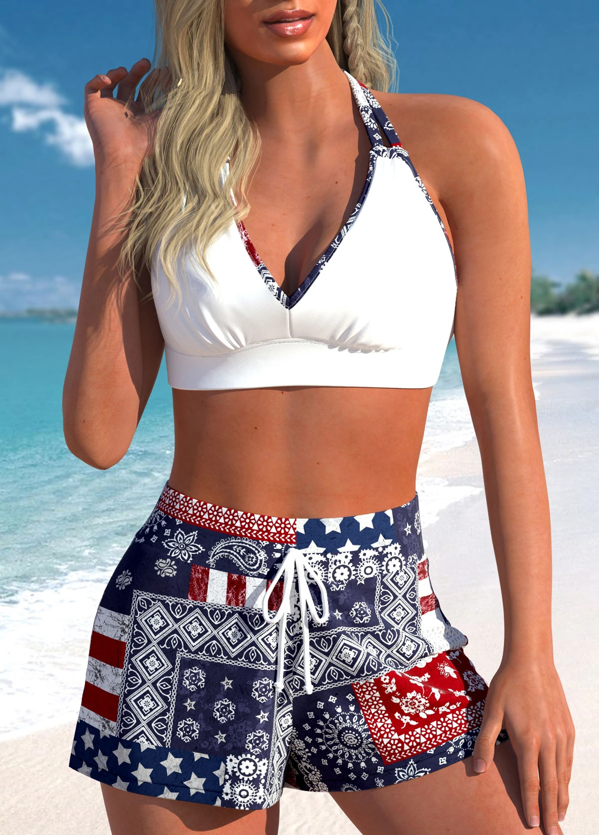 High Waisted Flag Print Patchwork Navy Bikini Set